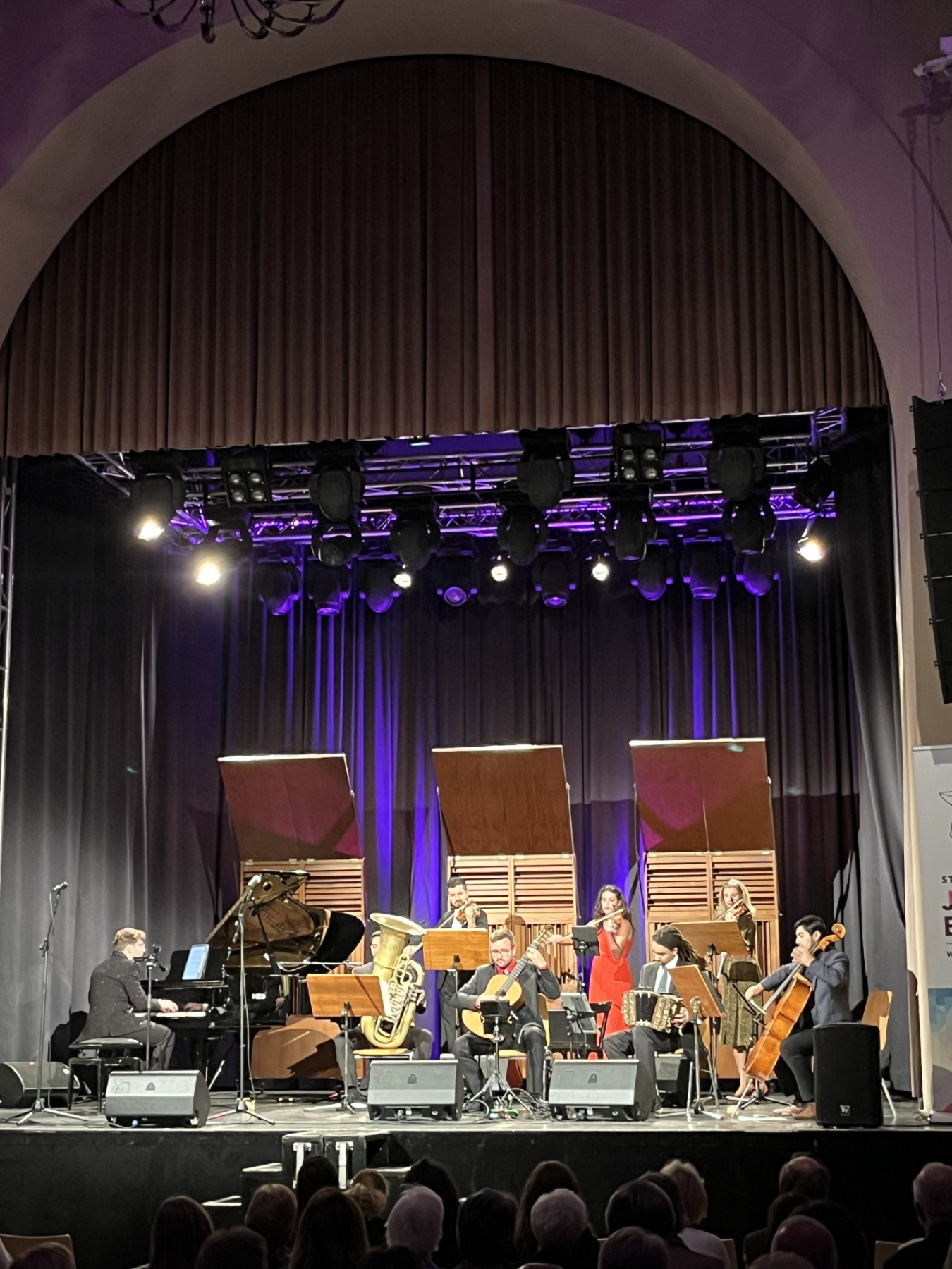 Das Ensemble beeindruckte nicht nur durch seine stilistische Bandbreite, sondern auch durch sein ungewöhnliches Klangbild. Die Besetzung – Tobias Kochseder am Bandoneon, Wolfram Freysmuth an der Violine, Christine Moik und Christine Rainer mit Gesang und Violine, Eduardo Antiao Barría am Violoncello, Jure Podvratnik an der Gitarre, Žan Milošič am Klavier und Alexander Hermann an der Tuba – sorgte für eine außergewöhnliche Klangtiefe.