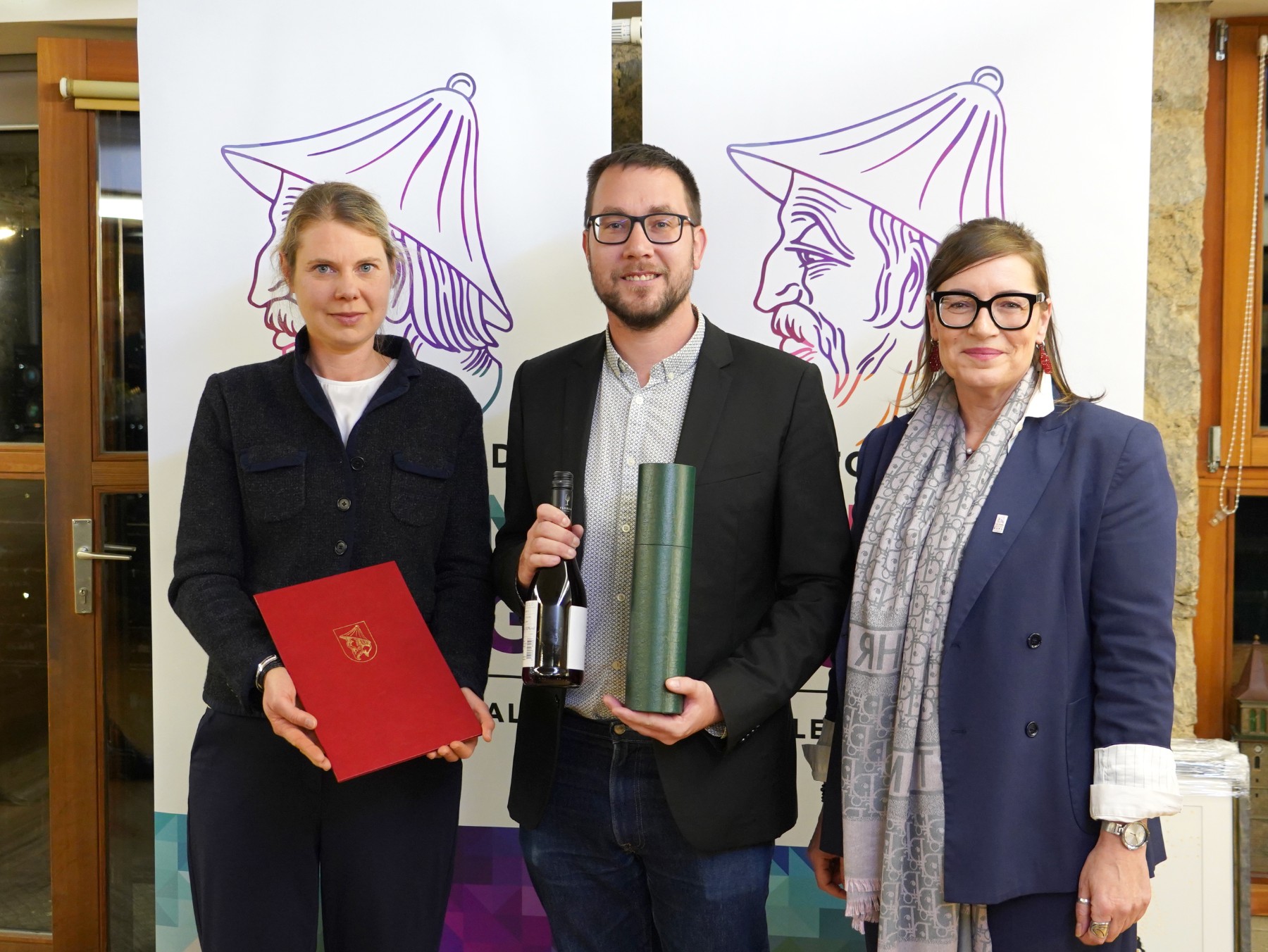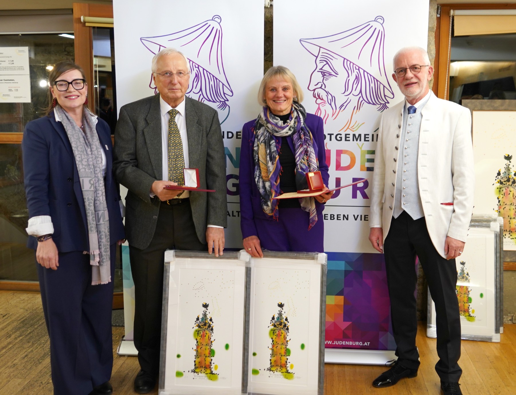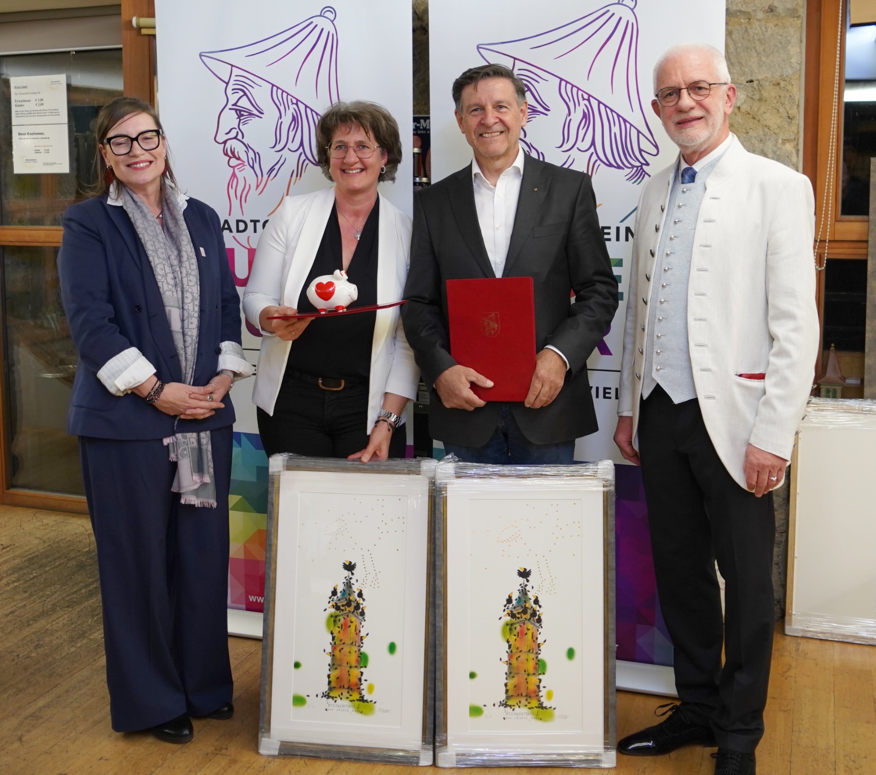Mag. Dieter Gall überreichte als Zeichen der Wertschätzung Bilder des Malers Michael Ferner (Sternenturm – der große Rabe) an die Geehrten.