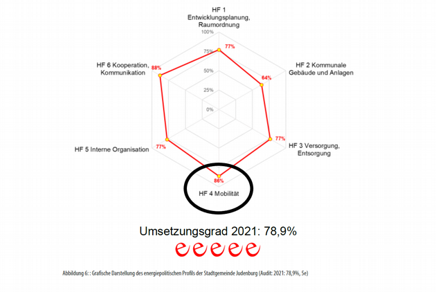 Das Spinnendiagramm zeigt die sechs Handlungsfelder und den Erfüllungsgrad von Judenburg. Eine langjährig aktive Gemeinde wie Judenburg zeichnet sich nicht durch einzelne isolierte Leuchtturmprojekte aus, sondern verfolgt quer durch die Bank eine vorbildliche Klimapolitik, die von vielen verschiedenen Akteurinnen und Akteuren getragen und umgesetzt wird. Dies zeigt sich in einem homogenen Profil mit einem möglichst hohen Umsetzungsgrad in allen Bereichen.