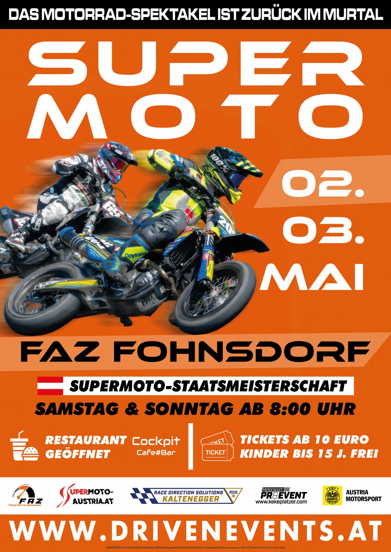 Das Motorrad-Spektakel ist zurück im Murtal: Supermoto-Staatsmeisterschaft mit den aktuellen Weltmeistern im FahrAktivZentrum Fohnsdorf (Fahrtechnikstraße 1, AT-8753 Fohnsdorf). Rahmenprogramm für Kinder, Gastronomie und Motorsport-Ausstellung. Jeden Tag ab 8:00 Uhr. Tickets an der Tageskasse erhältlich. Online-Vorverkauf und weitere Informationen auf www.drivenevents.at