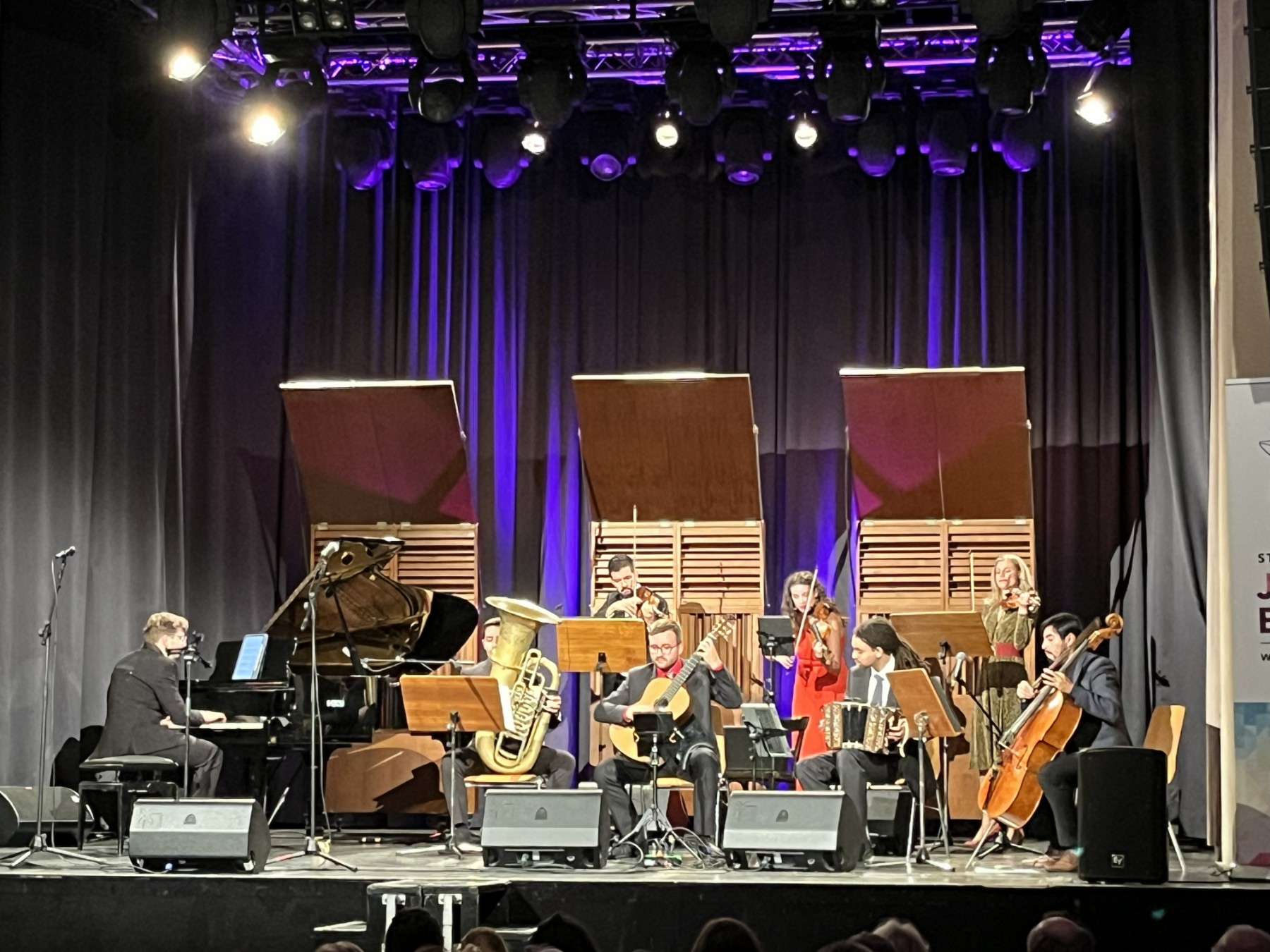 Das Ensemble beeindruckte nicht nur durch seine stilistische Bandbreite, sondern auch durch sein ungewöhnliches Klangbild. Die Besetzung – Tobias Kochseder am Bandoneon, Wolfram Freysmuth an der Violine, Christine Moik und Christine Rainer mit Gesang und Violine, Eduardo Antiao Barría am Violoncello, Jure Podvratnik an der Gitarre, Žan Milošič am Klavier und Alexander Hermann an der Tuba – sorgte für eine außergewöhnliche Klangtiefe.