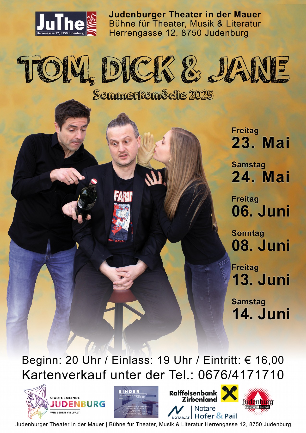 Mit viel Humor, Tempo und schauspielerischer Leidenschaft hat das Ensemble vom Judenburger Theater in der Mauer die britische Komödie „Tom, Dick & Jane“ in gewohnt brillanter Weise auf die Bühne gebracht.