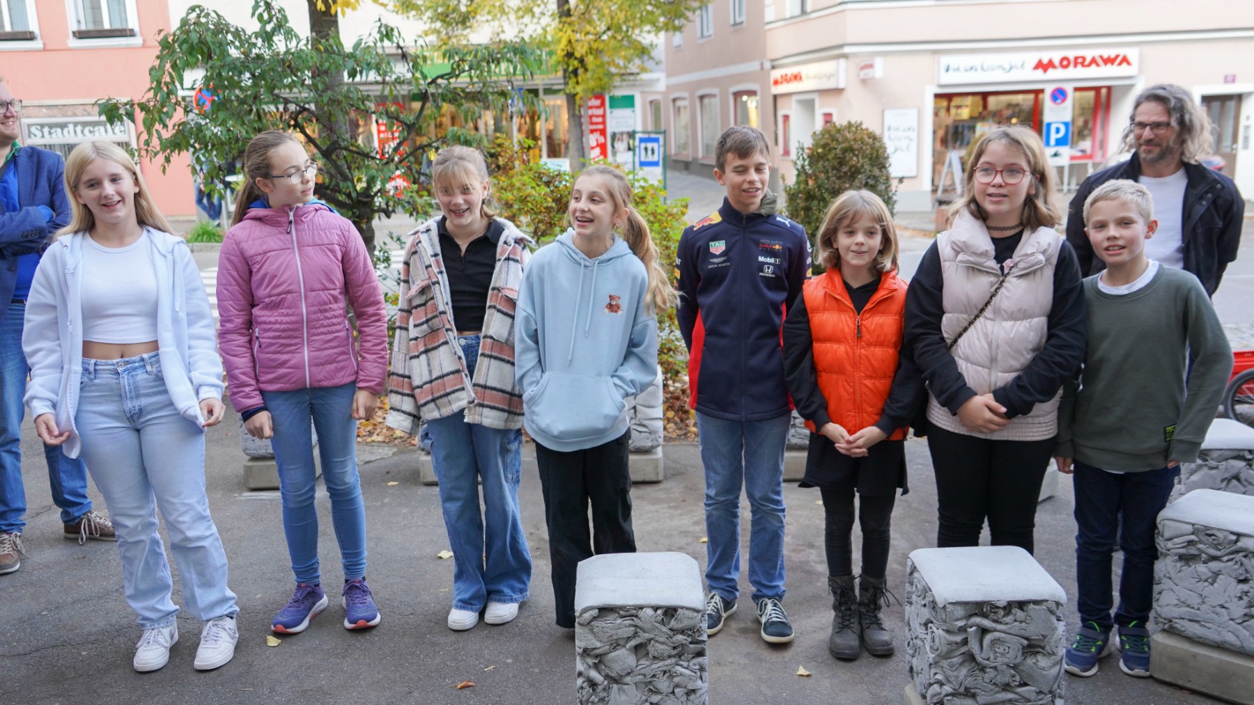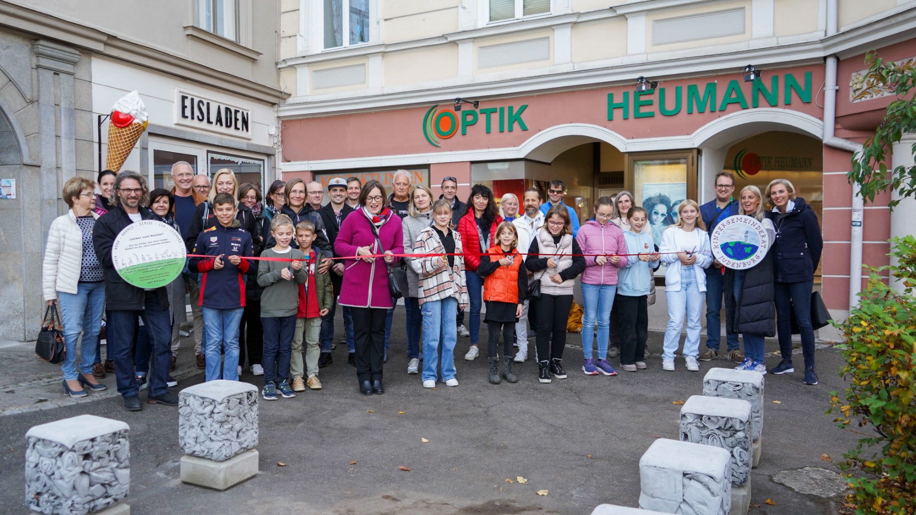 Die Kinder begaben sich auf Standortsuche in der Innenstadt und so wurde der Platz vor der Eisdrogerie-Eismanufaktur in der Burggasse 9 für die neuen Sitzgelegenheiten gefunden.