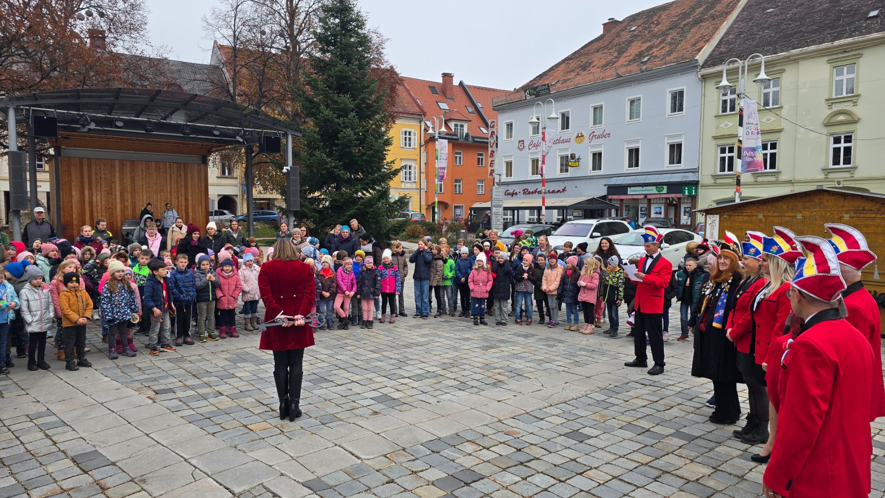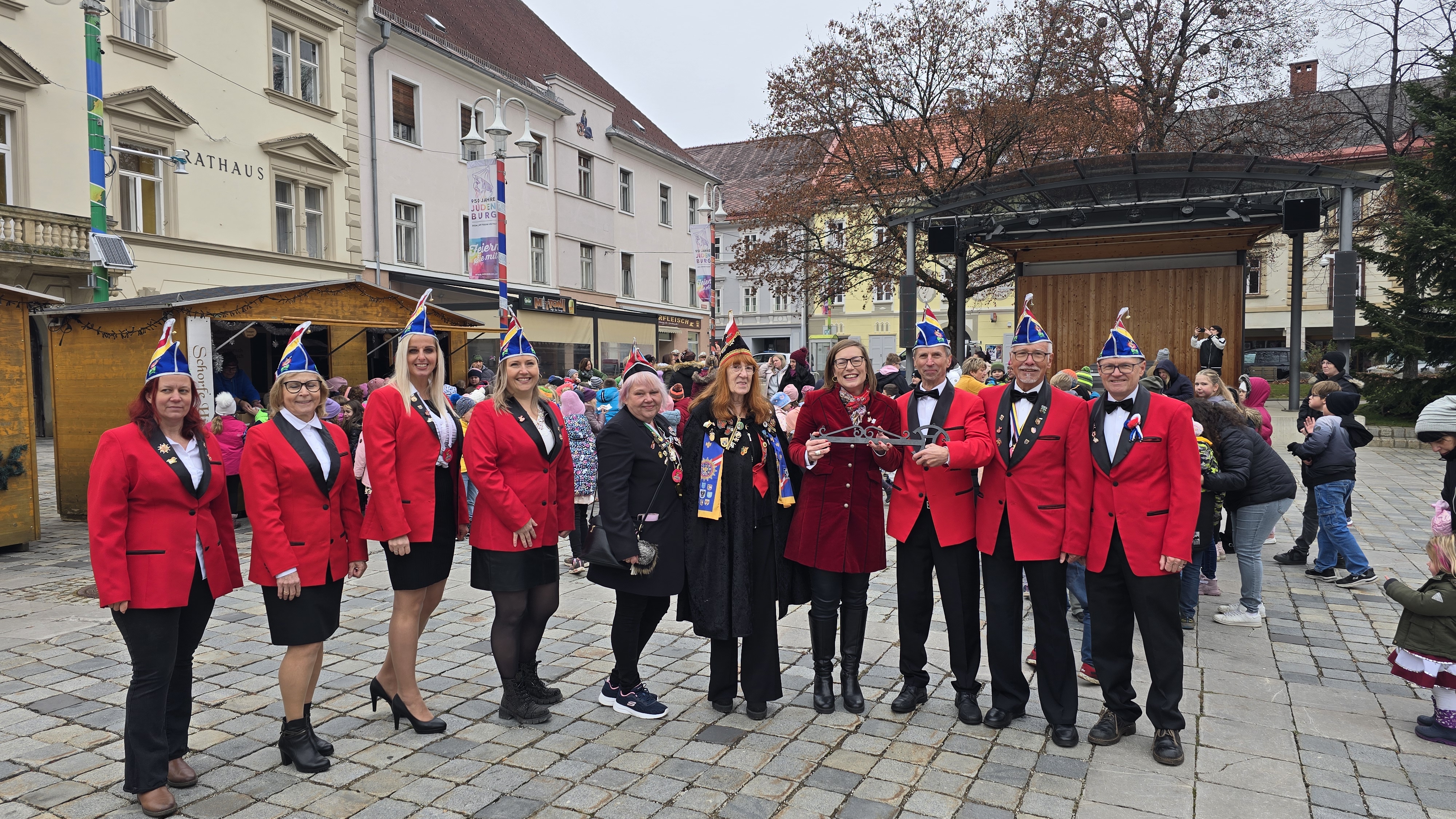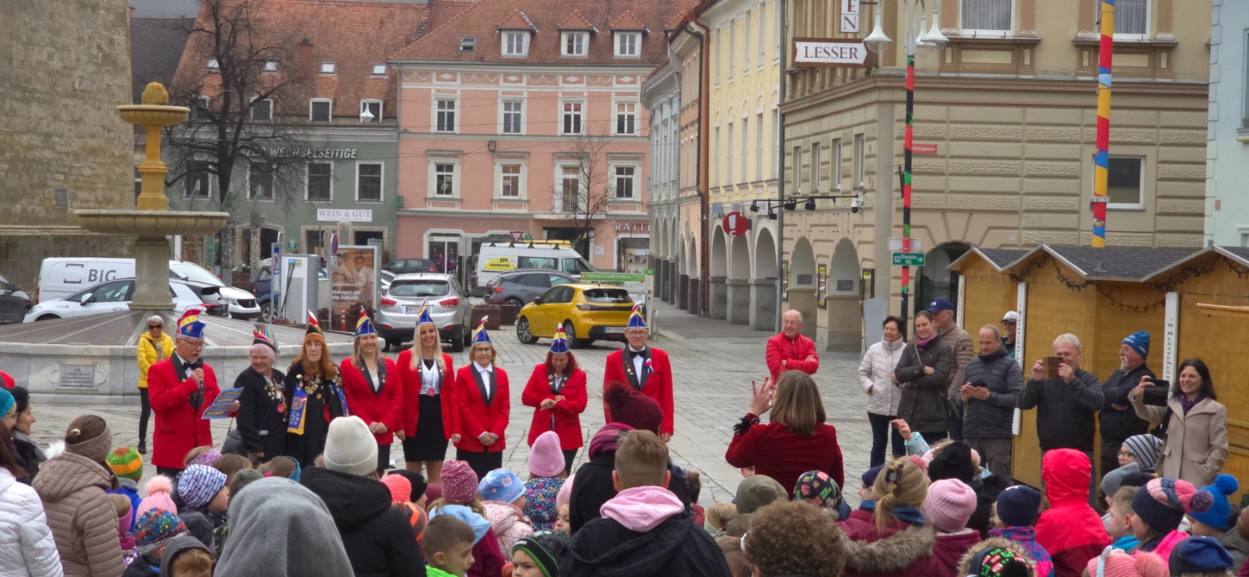 Pünktlich um 11 Uhr 11 wurde mit drei Warnschüssen (aus der Urenkelin der legendären „Berta“) das Narrenwecken lautstark eröffnet. Die Faschingsgilde hatte Verstärkung von rund 100 Volksschulkindern mitgebracht, die lauthals den Rathausschlüssel einforderten. Angesichts dieser Übermacht blieb Bürgermeisterin Elke Florian nichts anderes übrig, als den Schlüssel an die Faschingsgilde zu übergeben. Damit ist die Faschingssaison offiziell eröffnet.