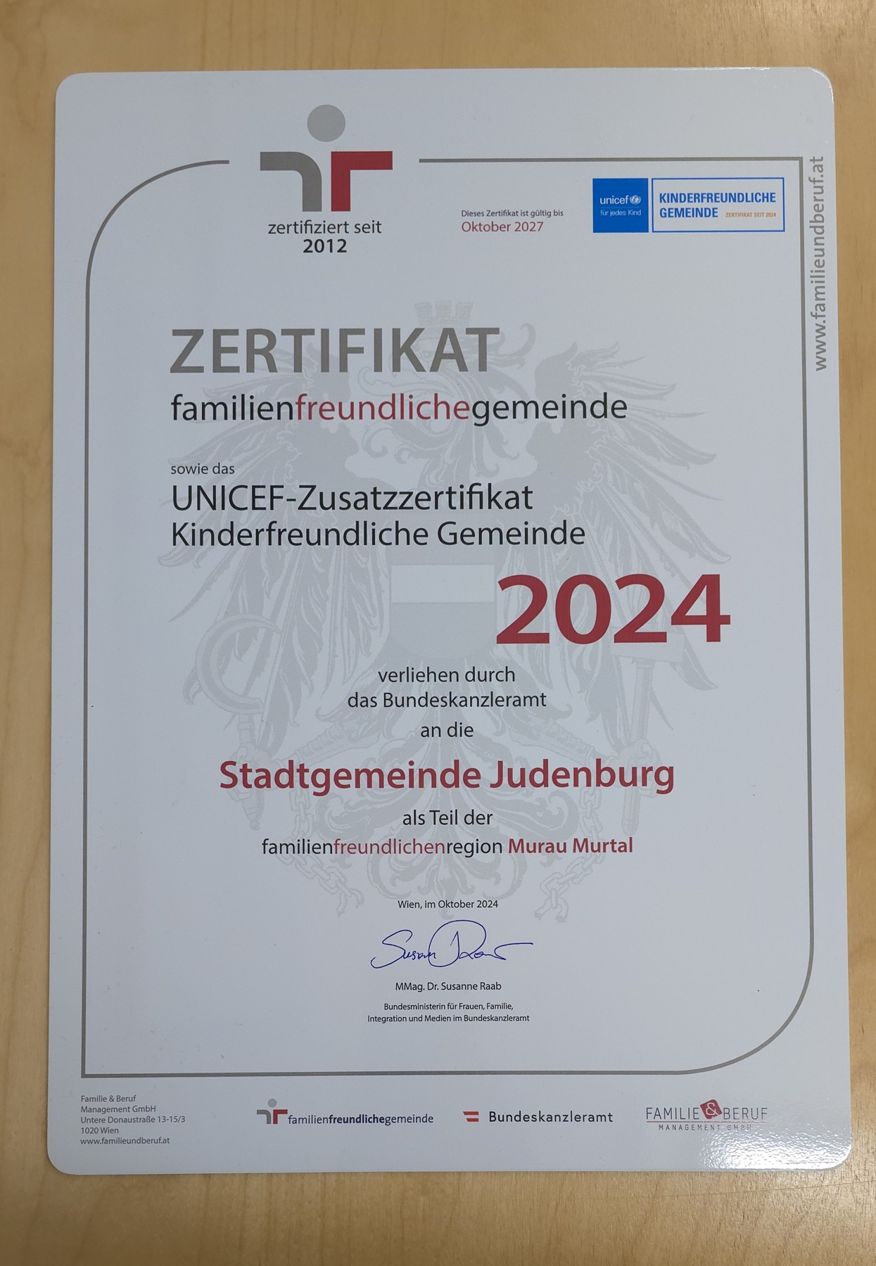 Die Stadtgemeinde Judenburg konnte das staatliche Gütezeichen „familienfreundliche Gemeinde“ als Teil der „familienfreundlichen Region Murau Murtal“, sowie das UNICEF-Zusatzzertifikat „Kinderfreundliche Gemeinde“ feierlich entgegennehmen.