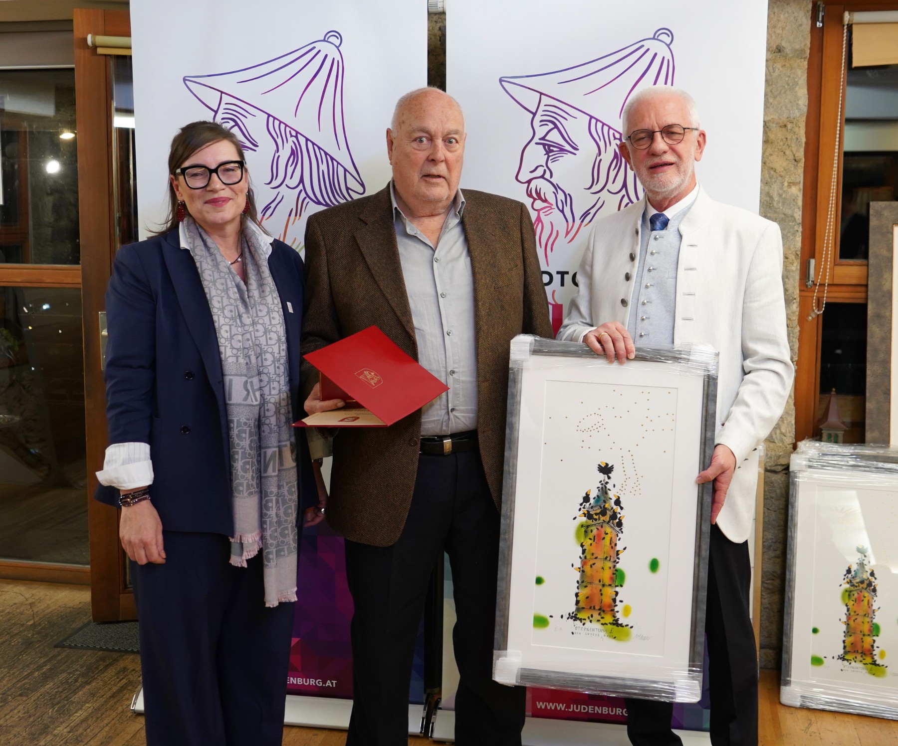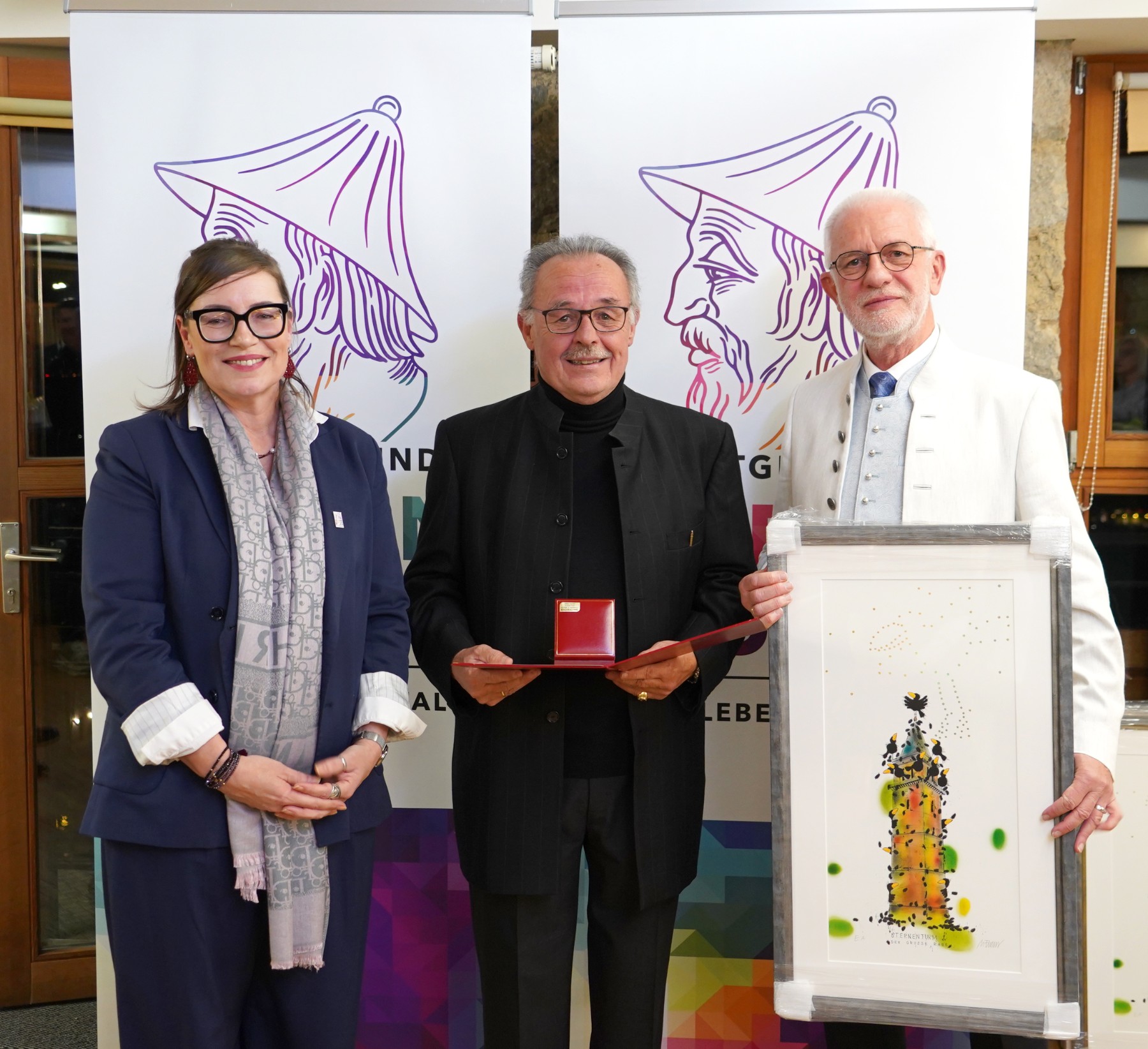 Mag. Dieter Gall überreichte als Zeichen der Wertschätzung Bilder des Malers Michael Ferner (Sternenturm – der große Rabe) an die Geehrten.