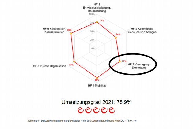 Das energiepolitische Profil der Stadtgemeinde Judenburg zeigt im Wesentlichen ein sehr homogenes Bild. Allein das Handlungsfeld 2 Kommunale Gebäude und Anlagen liegt nicht über 75%. Die Gemeinde erreichte auch bei diesem Audit das langfristige wünschenswerte Ziel, ein möglichst homogenes Bild mit möglichst hohem Umsetzungsgrad zu erreichen