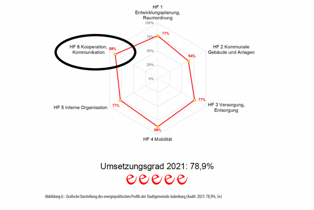 Das Spinnendiagramm zeigt die sechs Handlungsfelder und den Erfüllungsgrad von Judenburg. Eine langjährig aktive Gemeinde wie Judenburg zeichnet sich nicht durch einzelne isolierte Leuchtturmprojekte aus, sondern verfolgt quer durch die Bank eine vorbildliche Klimapolitik, die von vielen verschiedenen Akteurinnen und Akteuren getragen und umgesetzt wird. Dies zeigt sich in einem homogenen Profil mit einem möglichst hohen Umsetzungsgrad in allen Bereichen.