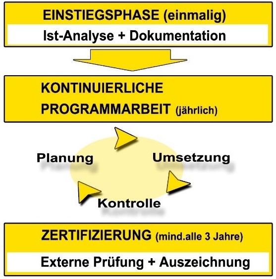 Vor Ort kümmert sich ein e5-Team um die Planung, Koordination und Umsetzung der kommunalen Projekte. Aktivitäten werden aber auch an vielen Orten und von vielen Menschen außerhalb der Gemeindestube gesetzt, wie in den Schulen, Kindergärten, Vereinen, von industriellen, gewerblichen und bäuerlichen Betrieben usw.